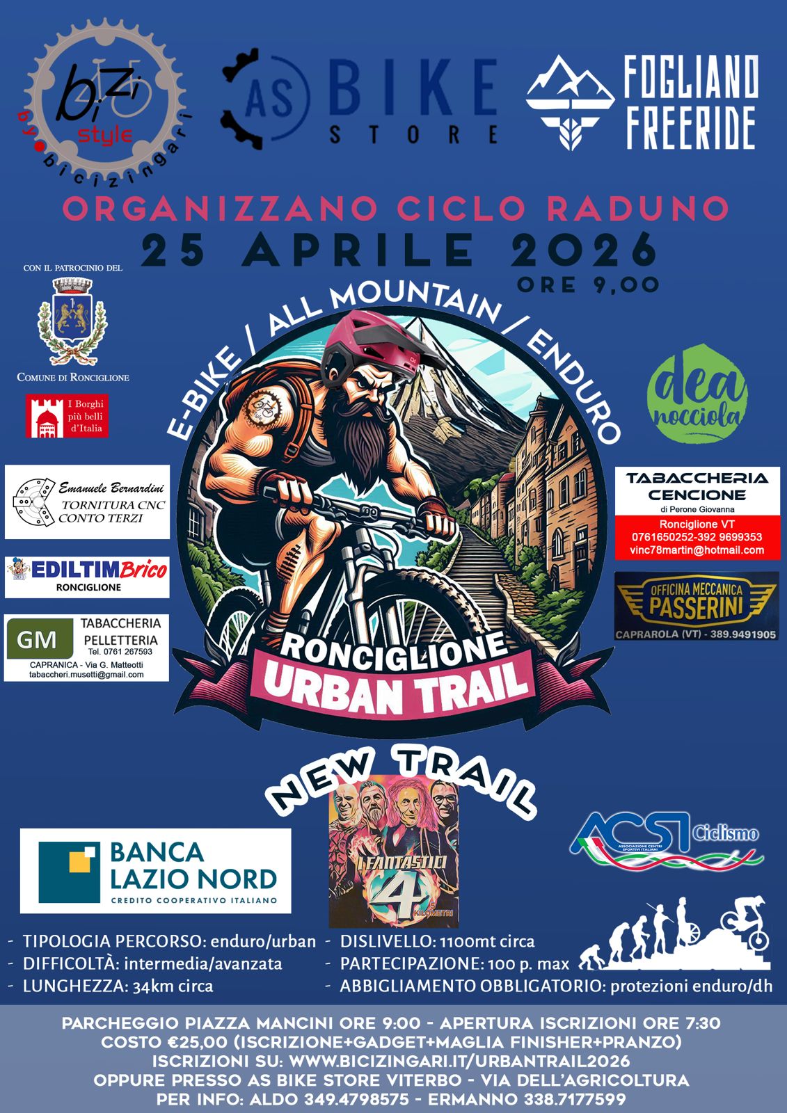 Il 25 aprile 2026, non perdere la prima edizione della RONCIGLIONE URBAN TRAIL! Organizzato dall'ASD Bi.Zi.Bike Lago di Vico “BiciZingari”, questo evento unico ti porterà a correre attraverso i vicoli medievali e rinascimentali di Ronciglione, immergendoti anche nella bellezza dei boschi, del lago e della campagna circostante. Un percorso misto che unisce storia, natura e adrenalina, adatto a tutti gli amanti del trail running e della scoperta. Sarà un'occasione speciale per vivere sport, cultura e paesaggio in un'unica, straordinaria giornata. All'arrivo, pasta party per tutti i partecipanti. Non mancare! Porta con te amici, famiglia e voglia di metterti in gioco! Per tutte le informazioni, visita www.bicizingari.it/URBANTRAIL2026. Preparati a vivere un'esperienza indimenticabile!